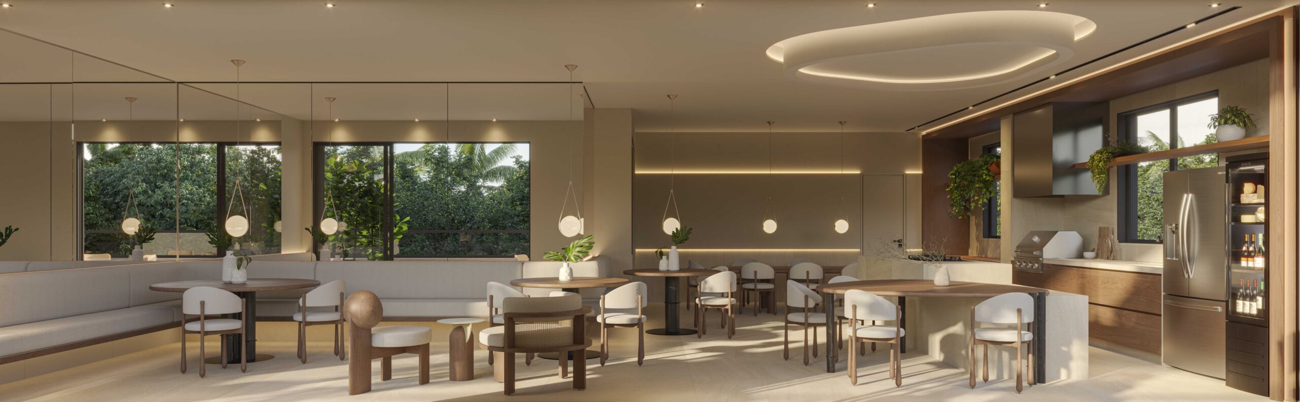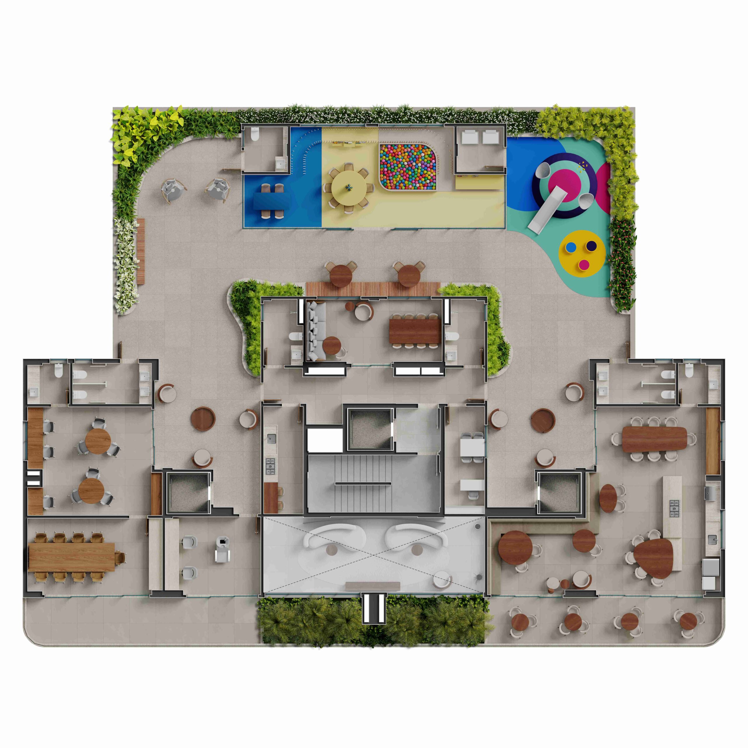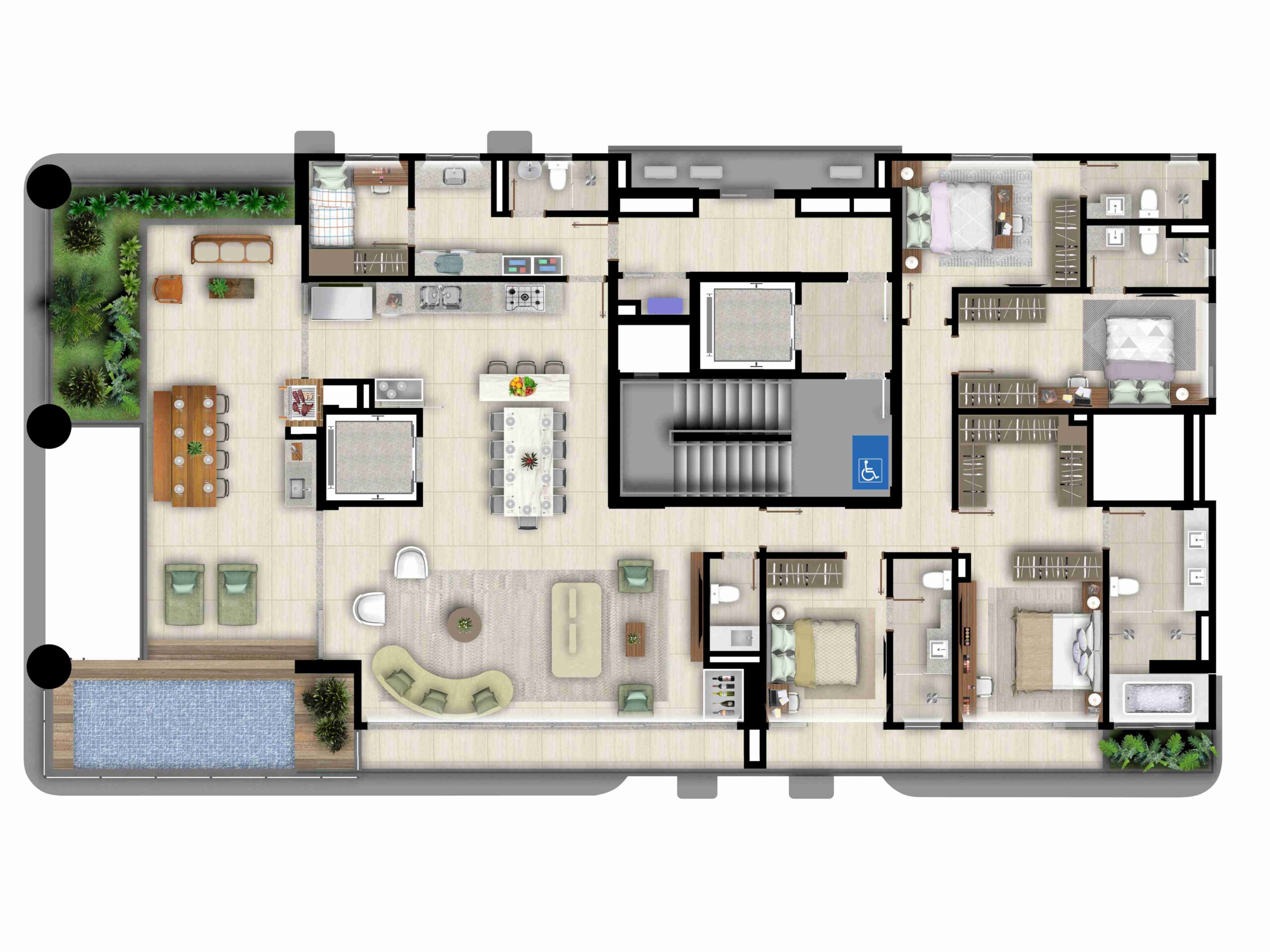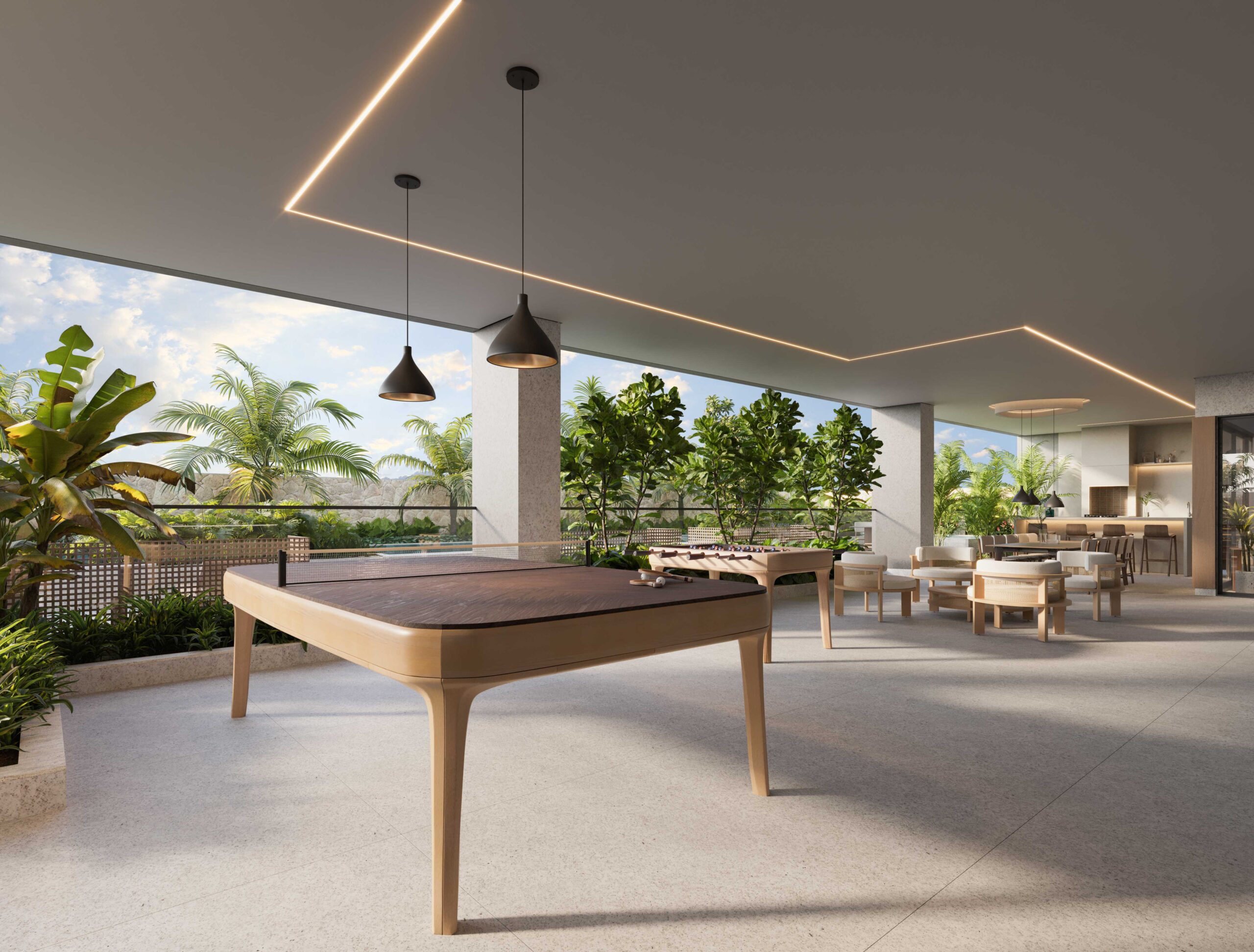 • Pisos em porcelanato de grande formato (120×120 cm) nas áreas sociais, e banheiros com pisos e revestimentos em porcelanato 90×90 cm*;