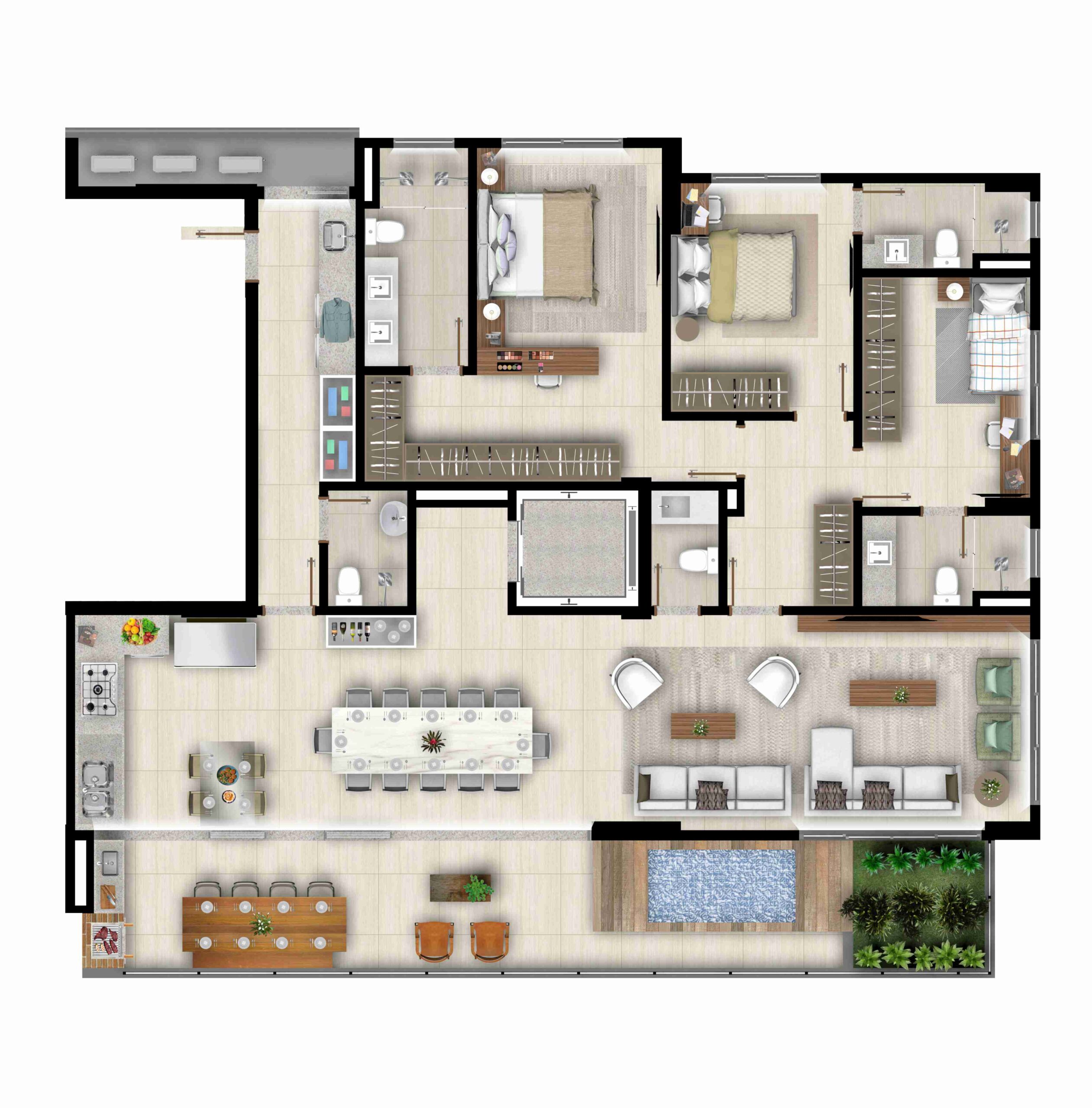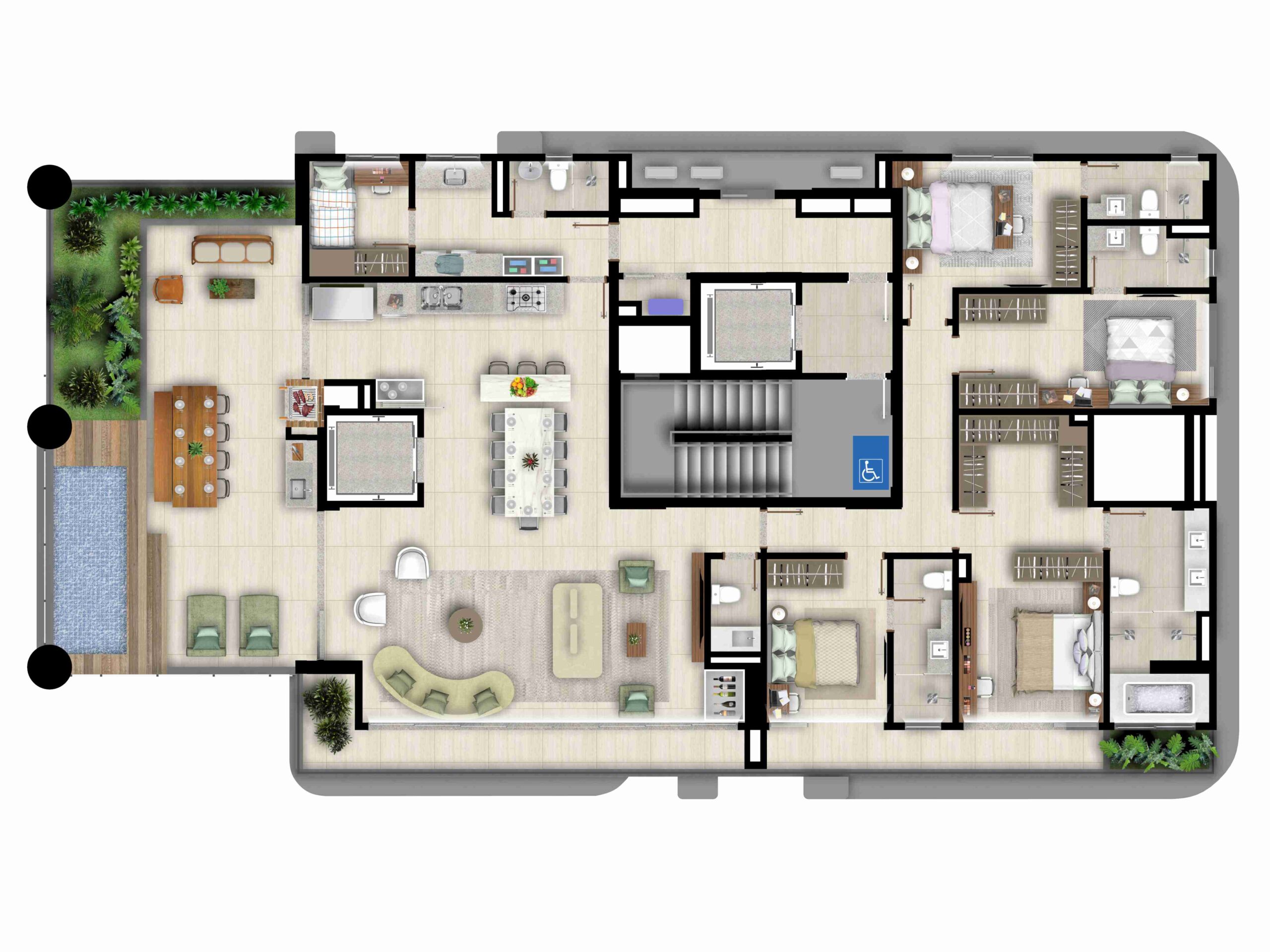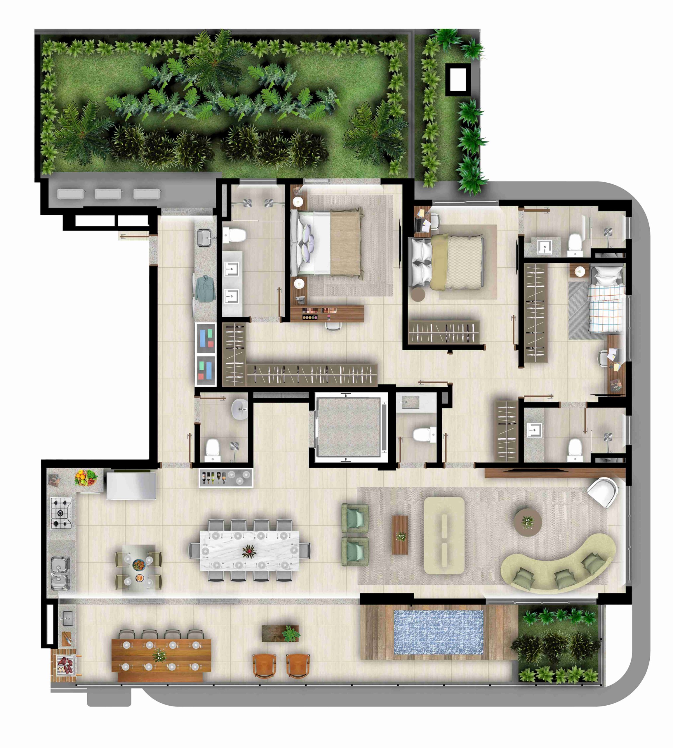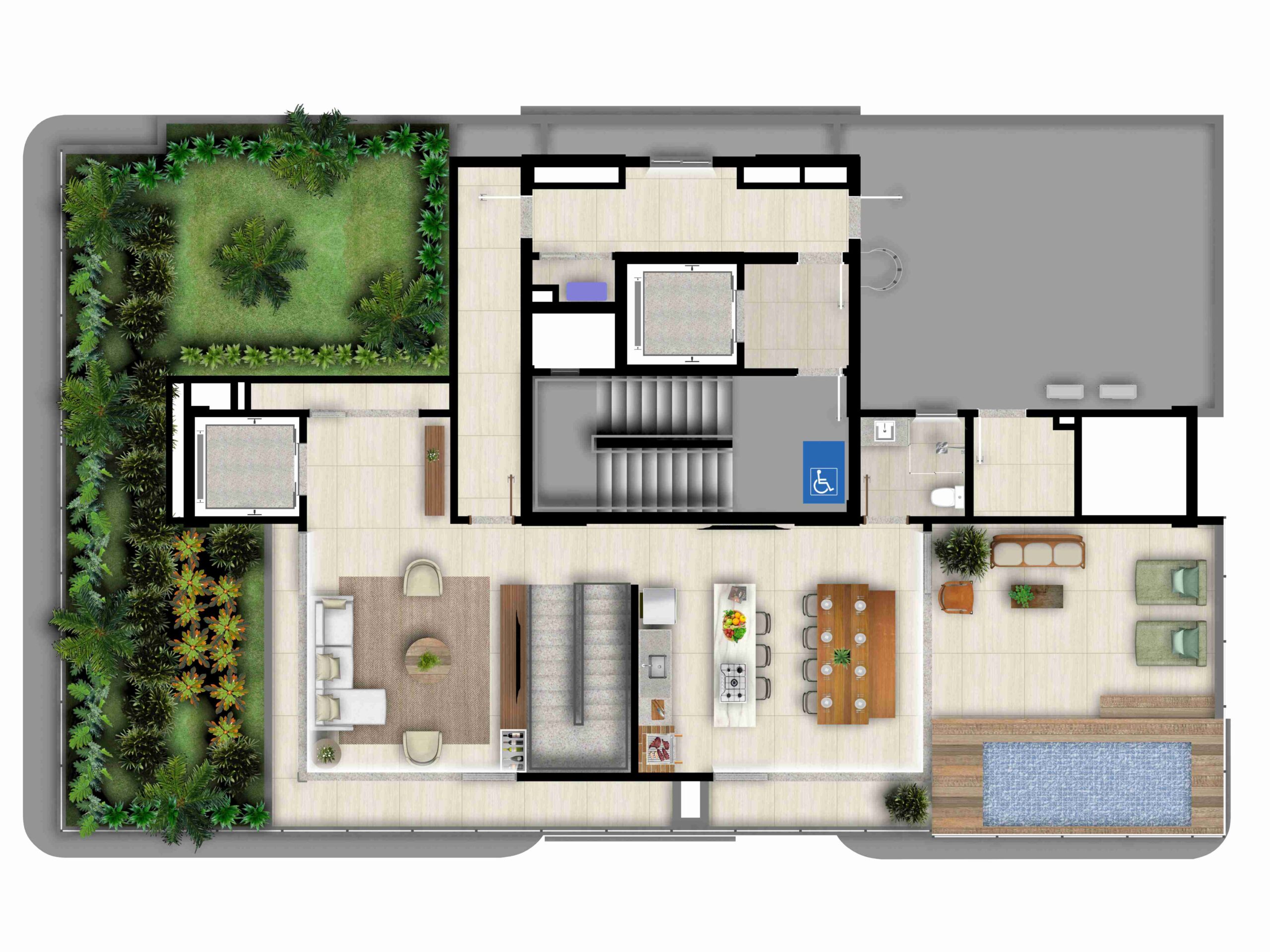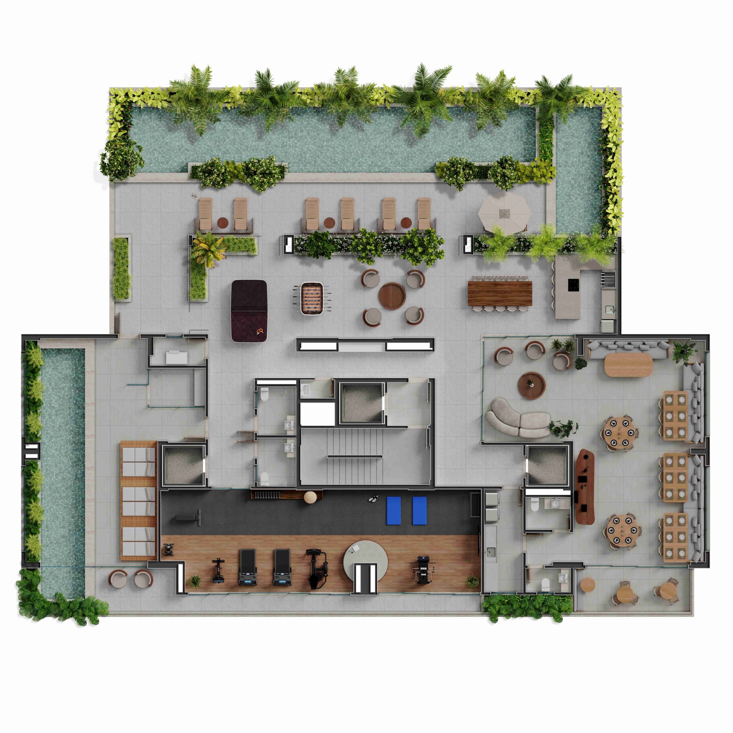 • Apartamentos tipo Penthouses com uma unidade por andar e varanda, jardim e piscina privativa*;