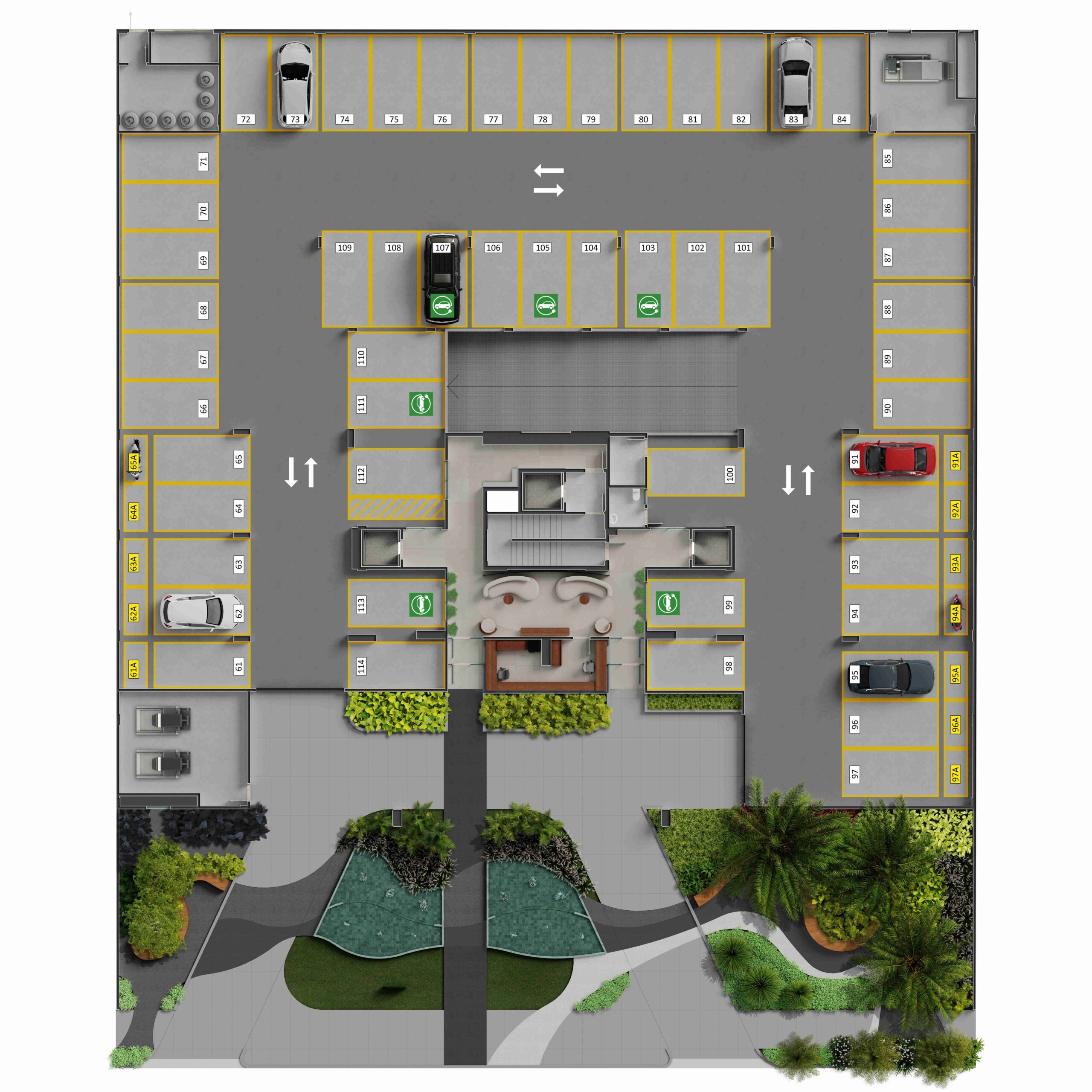 • Três vagas de garagem por apartamento tipo e quatro vagas nas penthouses*;